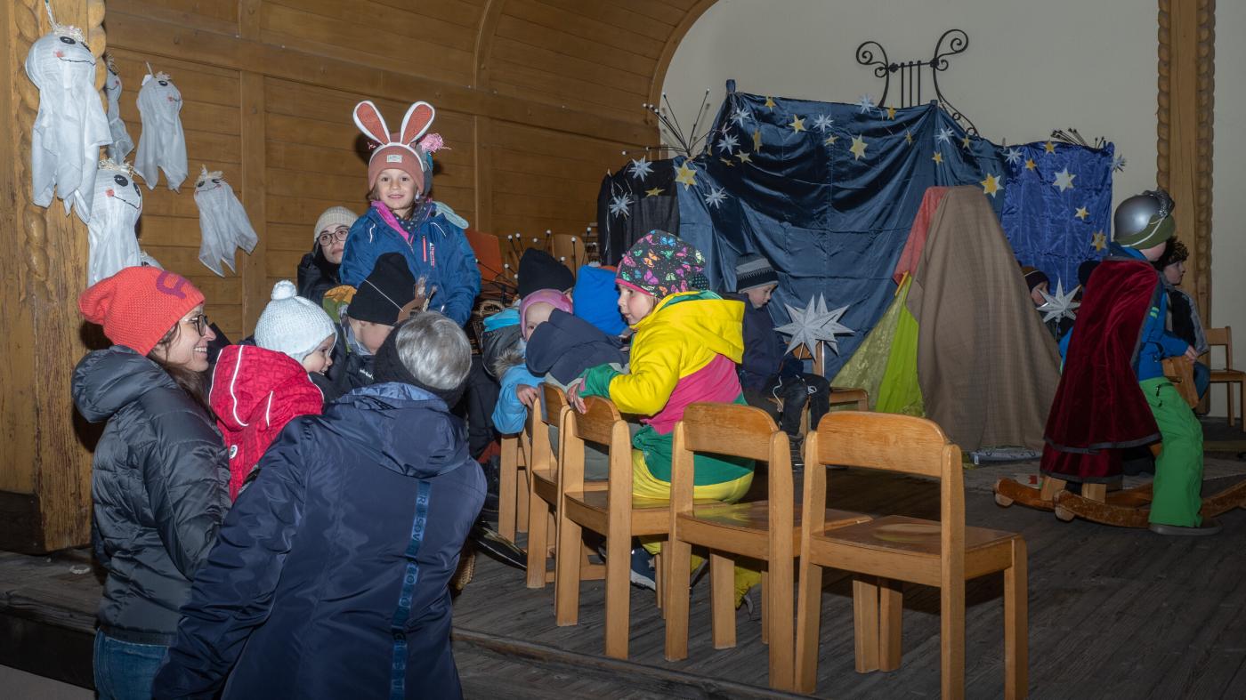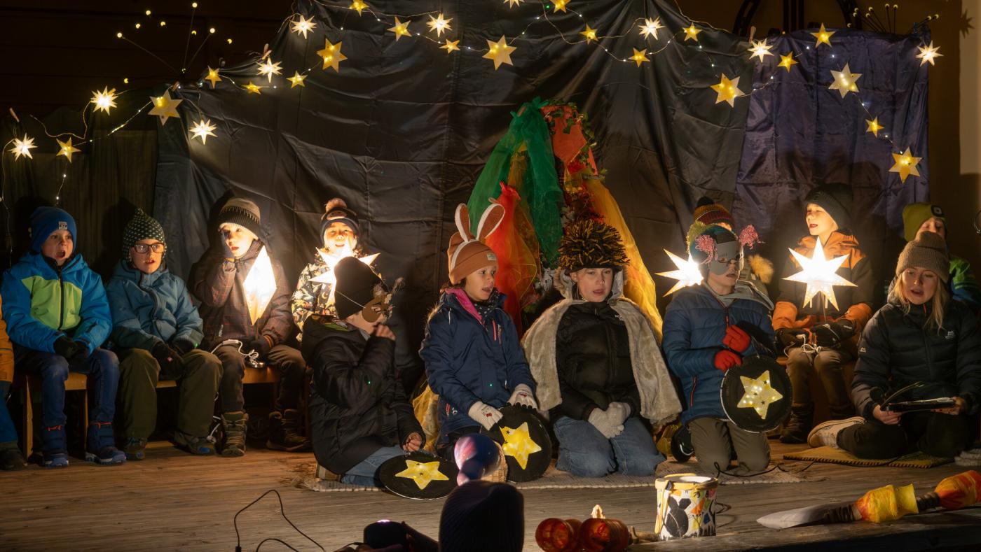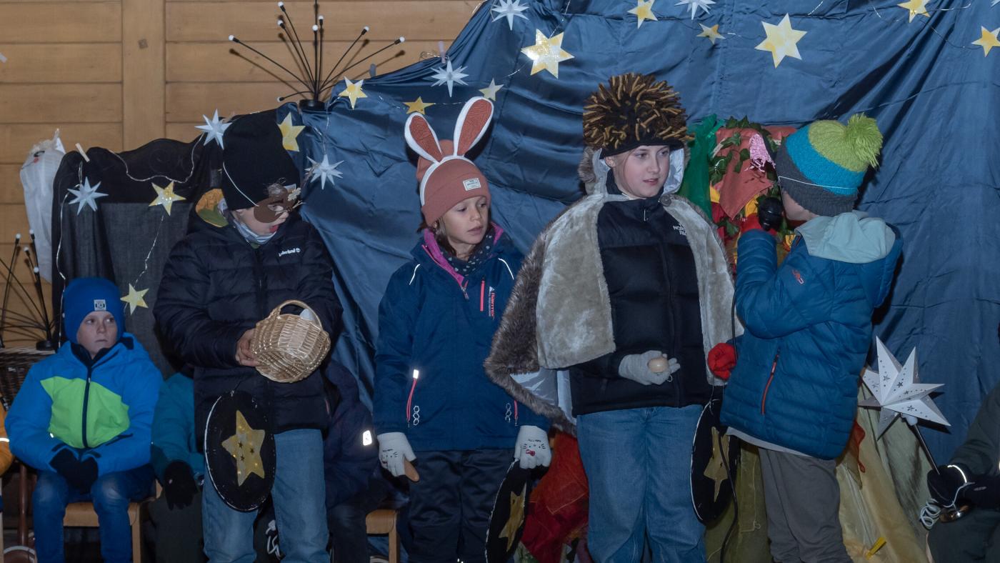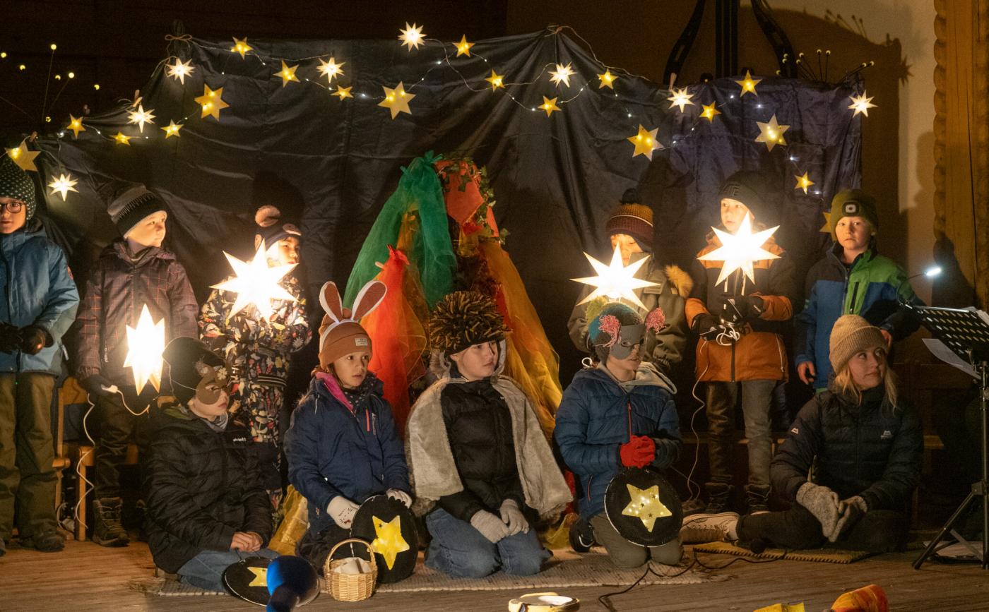 Zu Beginn wurde die Legende des Hl. Martin pantomimisch dargestellt, bevor das bezaubernde Minimusical „Der kleine Igel und das Sternenfest“ , aus der Feder von Kindergartenleiterin Claudia Veiter, aufgeführt wurde. Der kleine Igel liebte das Leuchten der Sterne. Als er jedoch mitten im Winter erwachte und keine Sterne leuchteten, fühlte er sich im Dunkeln einsam. Doch da kamen seine Freunde der Hase, die Maus und das Eichhörnchen. Sie brachten Lichter und feierten ein ein fröhliches Sternenfest – eine Hommage an die Freundschaft.