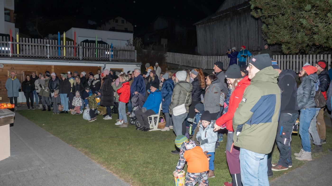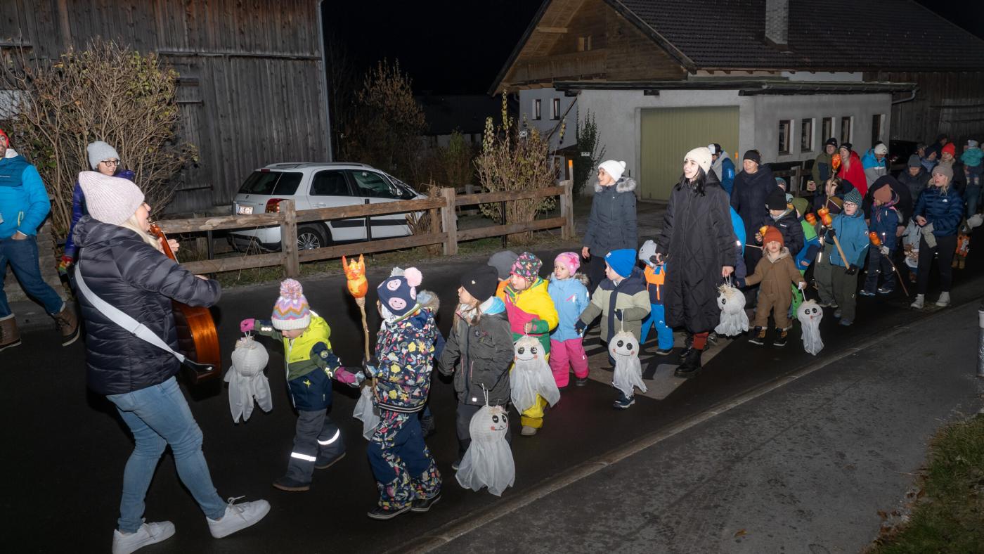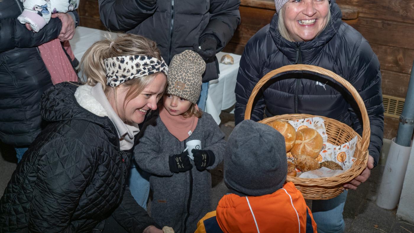 Anschließend zogen die Kinder mit ihren selbstgebastelten Laternen durch die Nacht. Im Schulhof teilten sie Brot, gespendet von der Bäckerei Ruetz, und genossen Tee, vorbereitet von Elternvertreterinnen. Ein Fest, das Gemeinschaft und Teilen in den Vordergrund stellte!