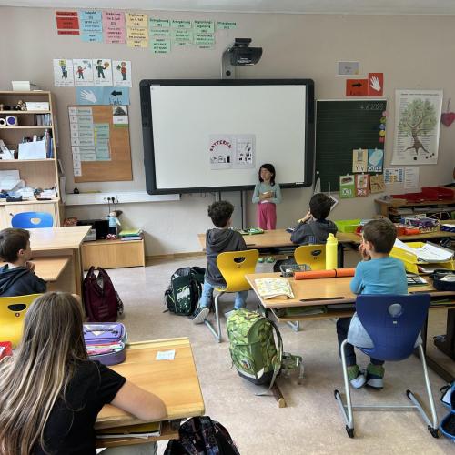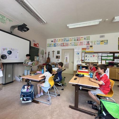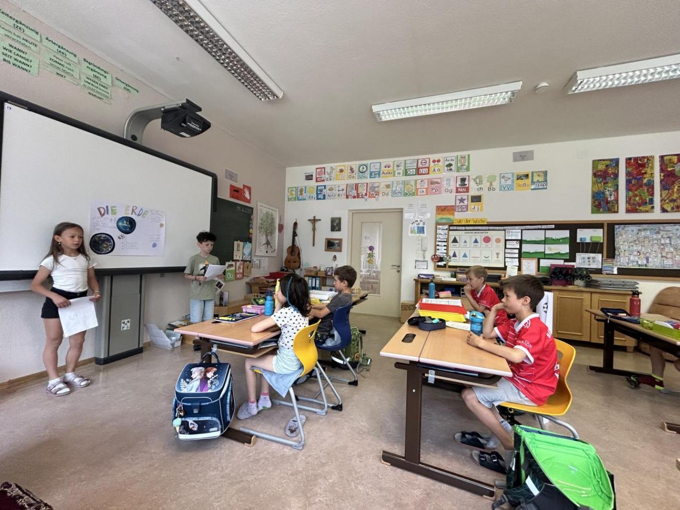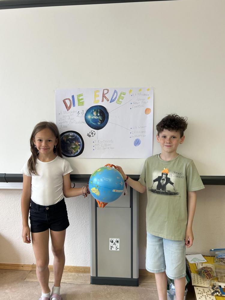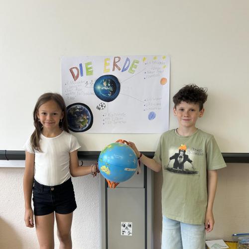 Matheo und Nina nahmen uns mit auf eine Reise um die Erde: Wir erfuhren Spannendes über ihre Entstehung, die Kontinente, Länder, Sprachen und ihre vielen Bewohner.