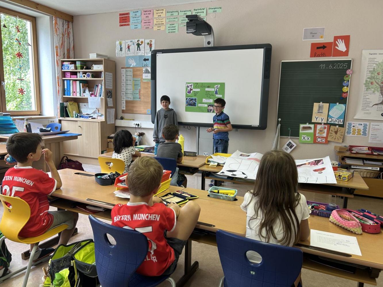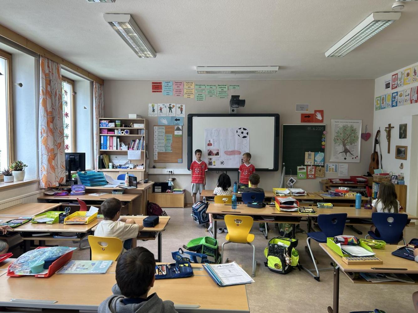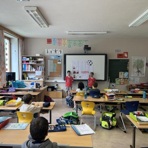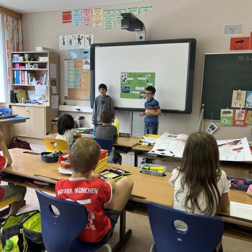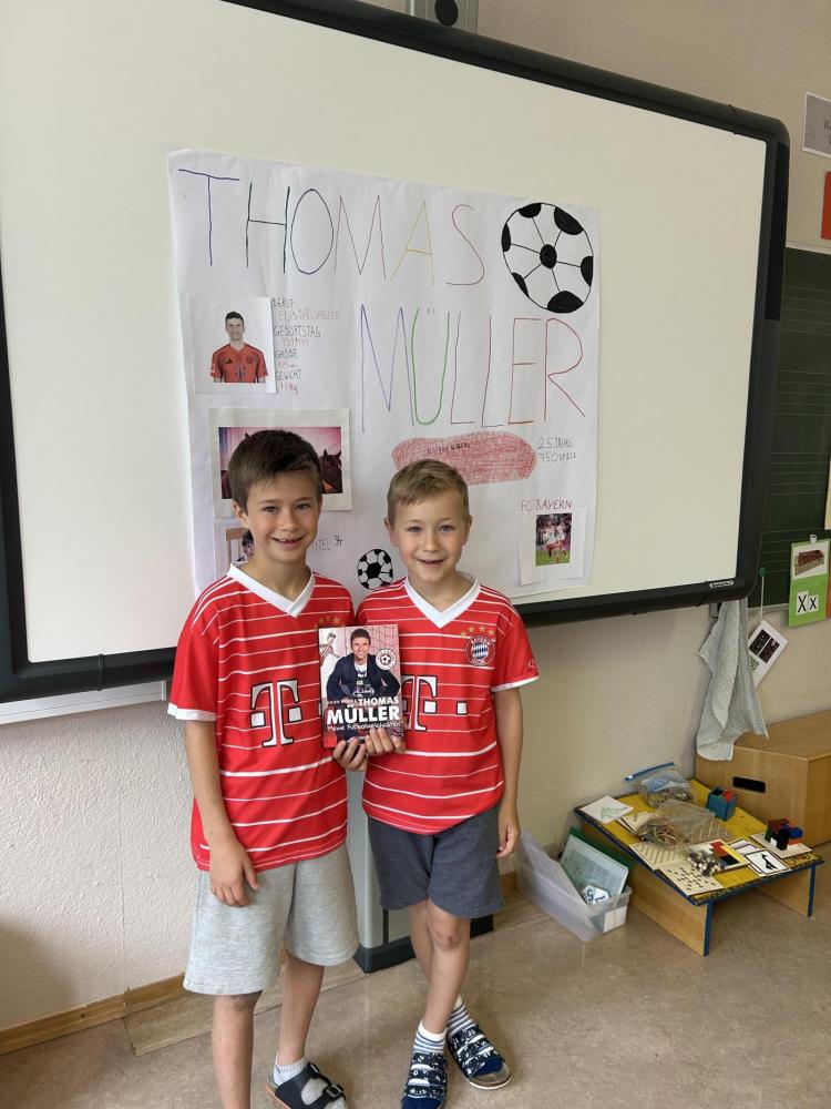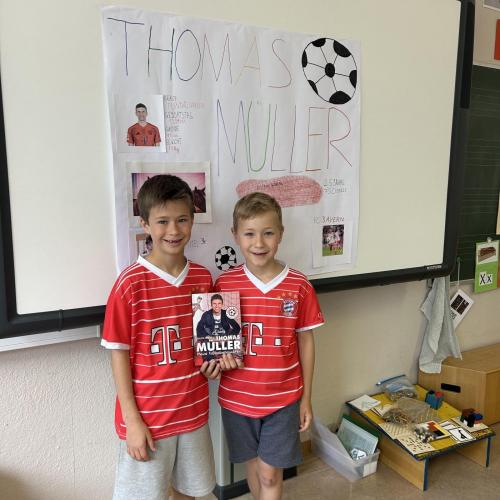 Leo und Lian stellten uns den Fußballstar Thomas Müller vor – von seinen Anfängen beim FC Bayern über seine Erfolge bis hin zu seinem Leben abseits des Fußballfeldes erfuhren wir spannende Fakten.
