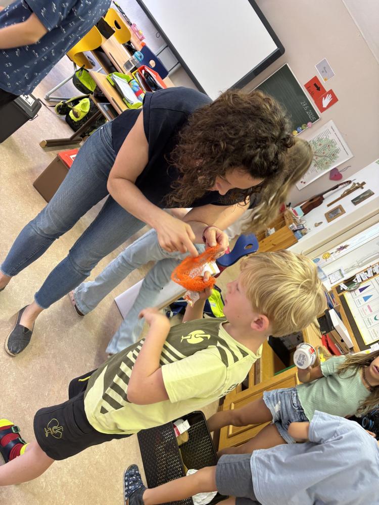 Mit im Gepäck hatte sie einen großen Sack voller unterschiedlichster Müllsorten – von Papier/Karton über Kunststoff bis hin zu Metall. Nach einer kurzen Einführung wurden die Materialien im Klassenraum verteilt, und die Kinder durften selbst aktiv werden: Sie ordneten den Müll den passenden Containern zu und überprüften anschließend gemeinsam mit Michaela die Richtigkeit ihrer Entscheidungen. Besonders interessant waren dabei die sogenannten Fehlwürfe, die Anlass für viele Aha-Momente boten.