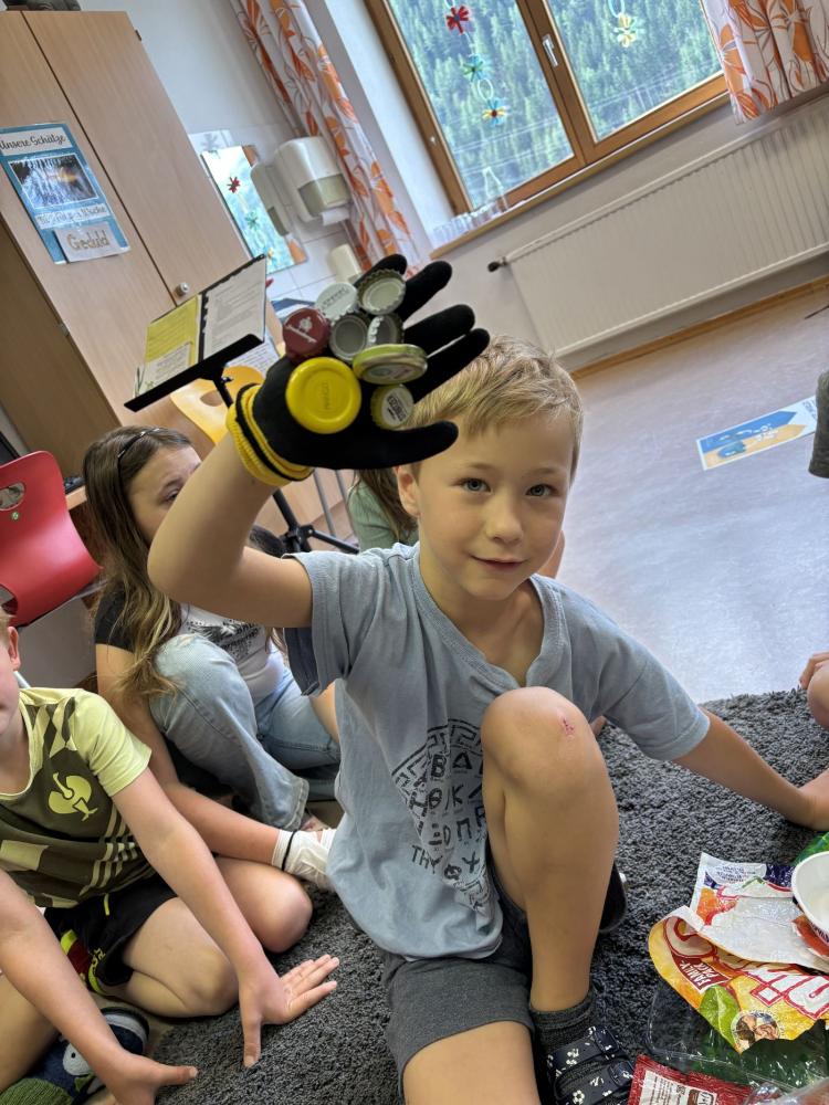 Ein zentrales Thema war auch die neue Regelung zur gemeinsamen Sammlung von Kunststoff und Aluminium. Warum das nun möglich ist, wurde anschaulich erklärt – unter anderem mit einem spannenden Experiment: Die Kinder durften mit einem Magneten, versteckt in einem Handschuh, ausprobieren, wie Aluminium aus dem Kunststoffmüll aussortiert werden kann.