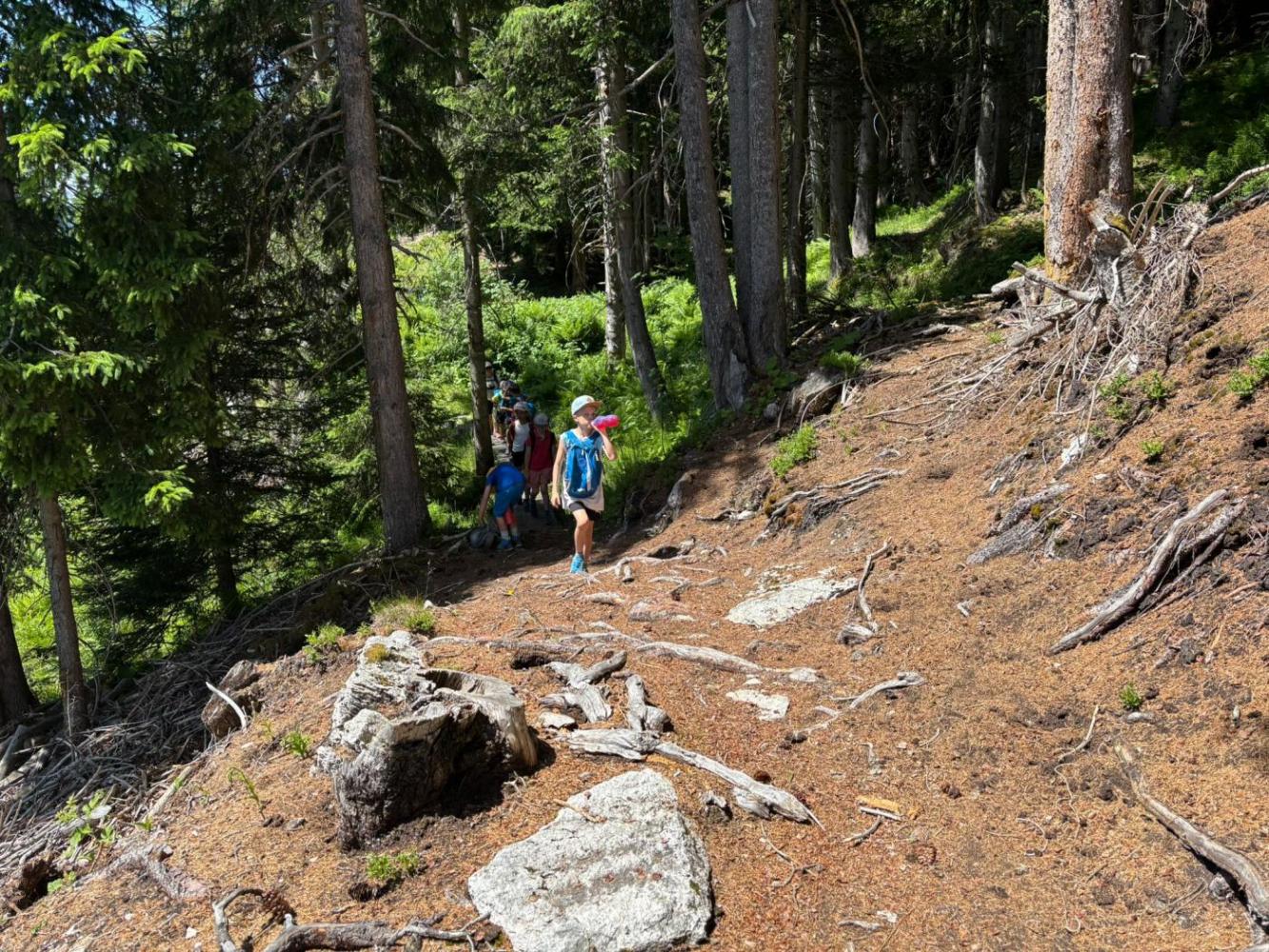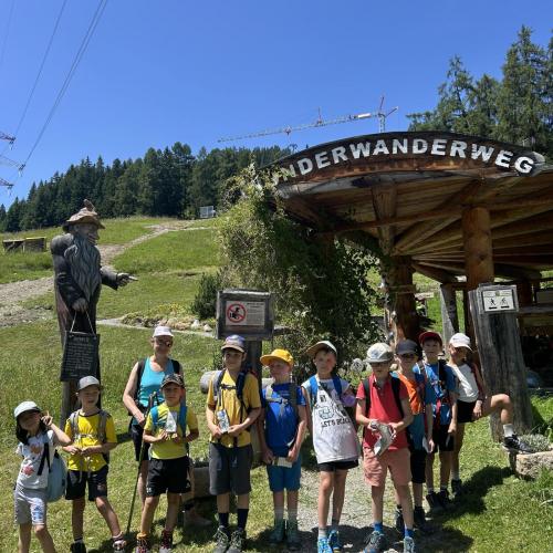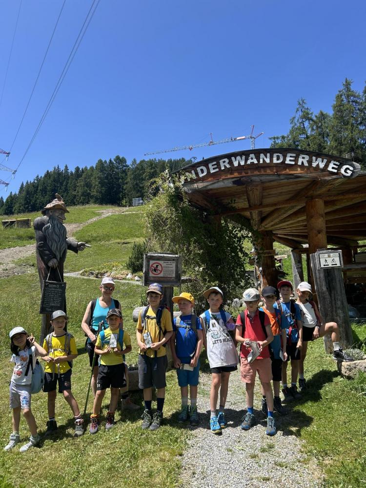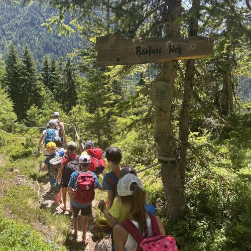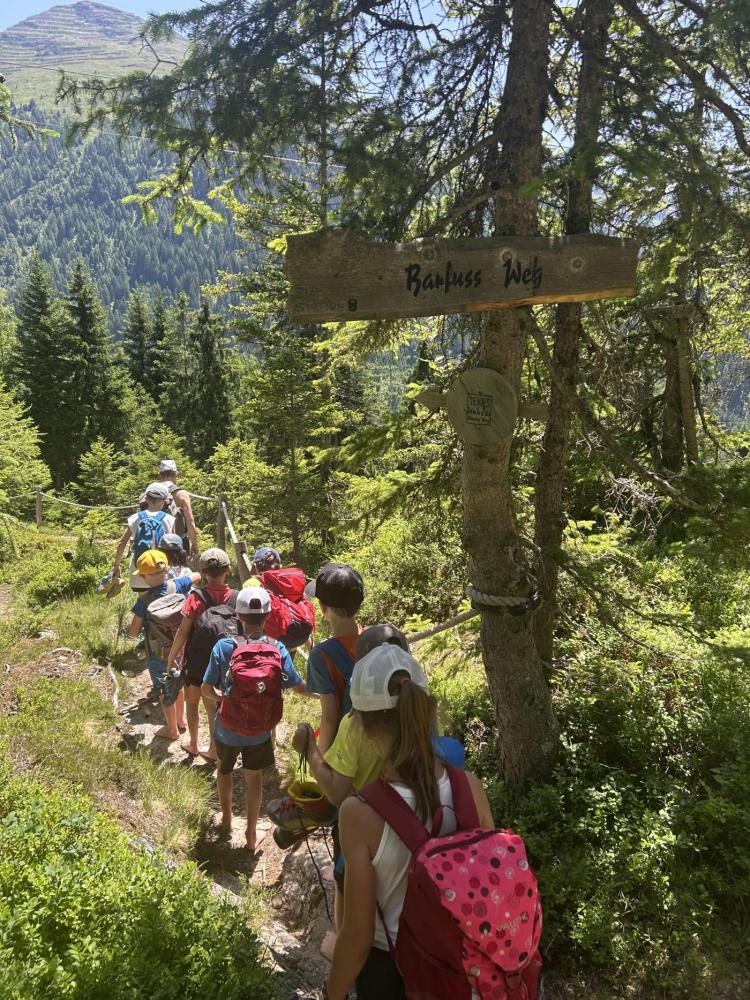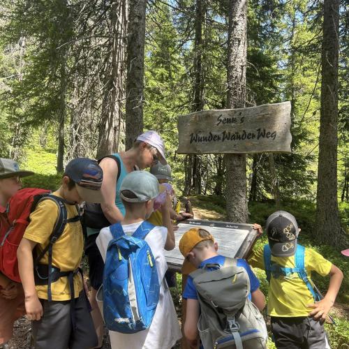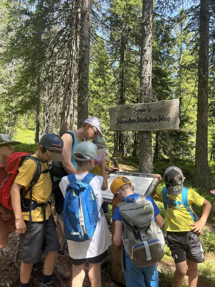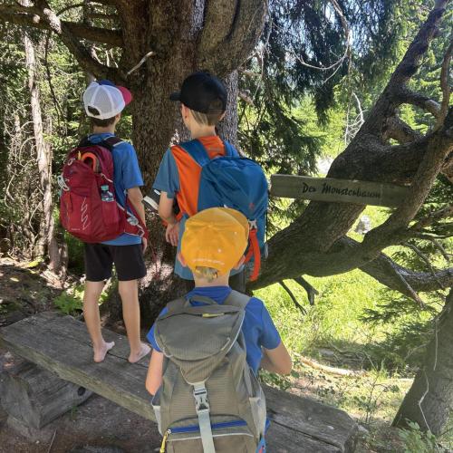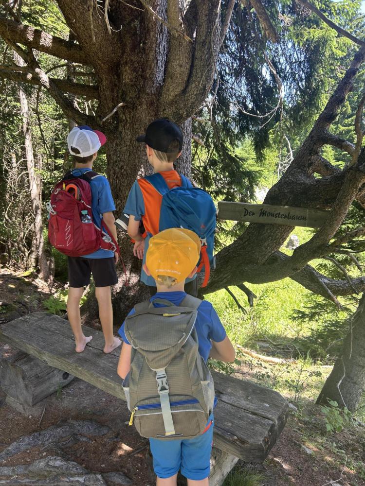 Gestärkt wanderten wir weiter zurück in Richtung St. Anton. Unterwegs entdeckten wir viele spannende Schilder mit interessanten Informationen zur Natur. Nach ein paar kurzen Verschnaufpausen erreichten wir den Wunderwanderweg. Barfuß über verschiedene Untergründe gehen, durch das Guggloch schauen, die Alpenglocke läuten, das Natur-Fenster entdecken und den Monsterbaum bestaunen – für alle war etwas dabei.