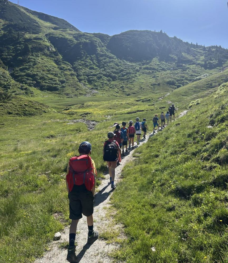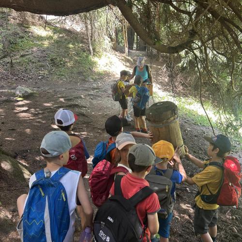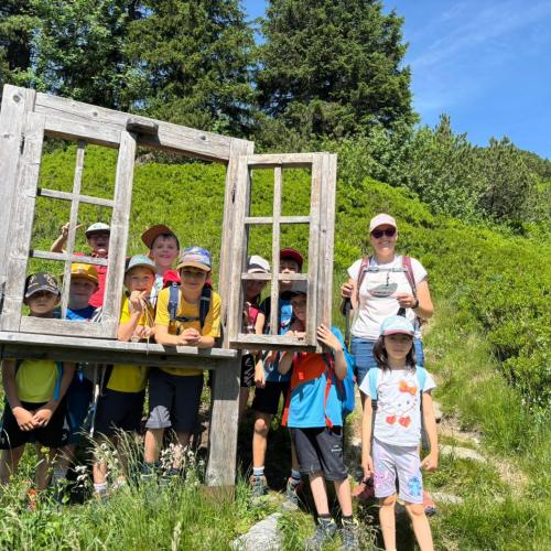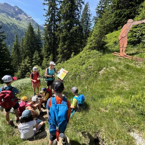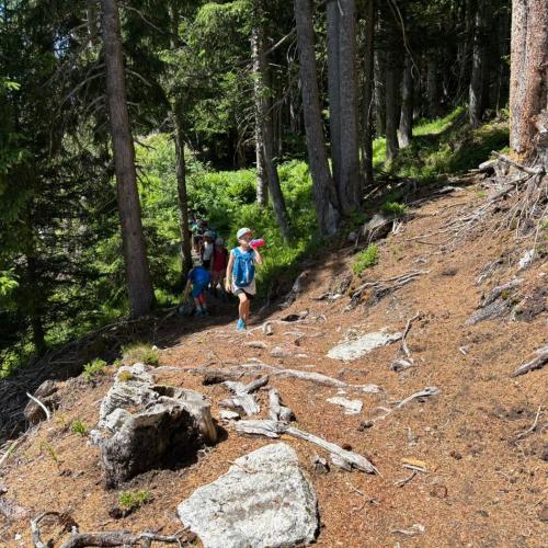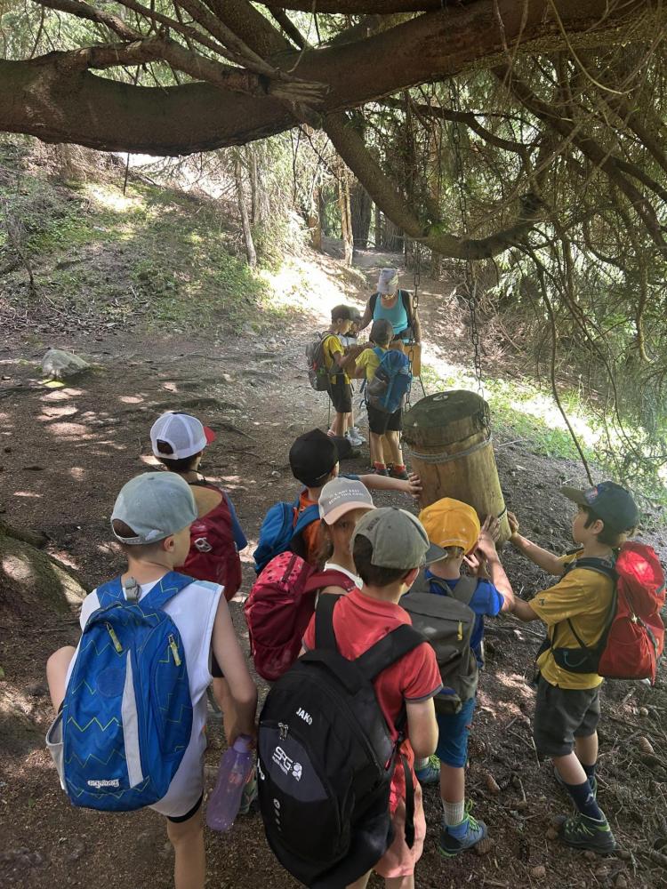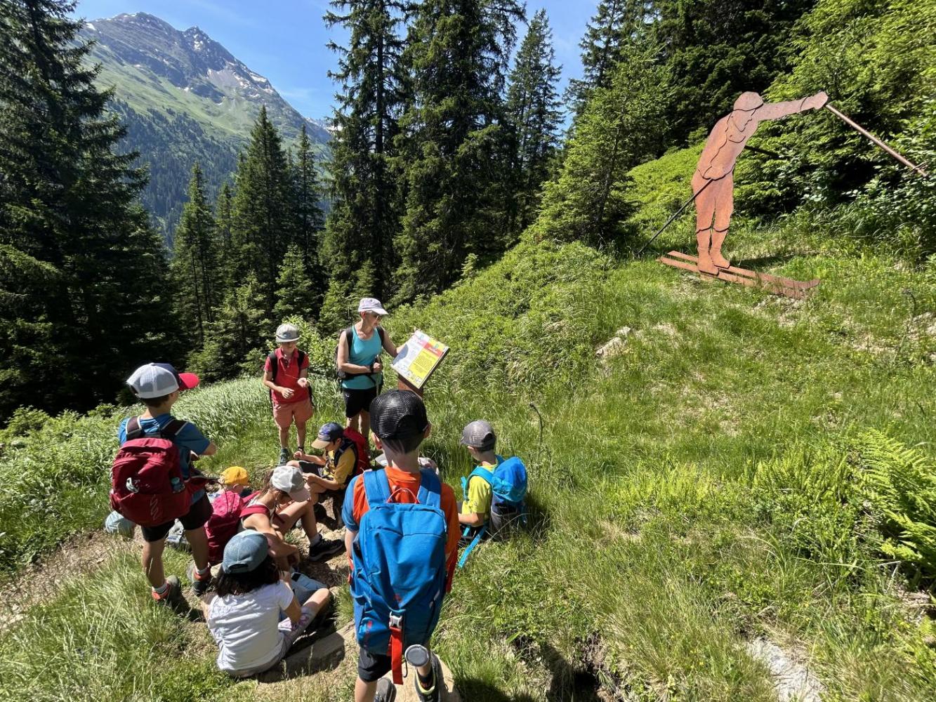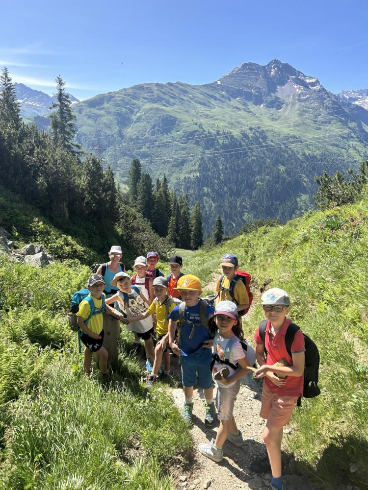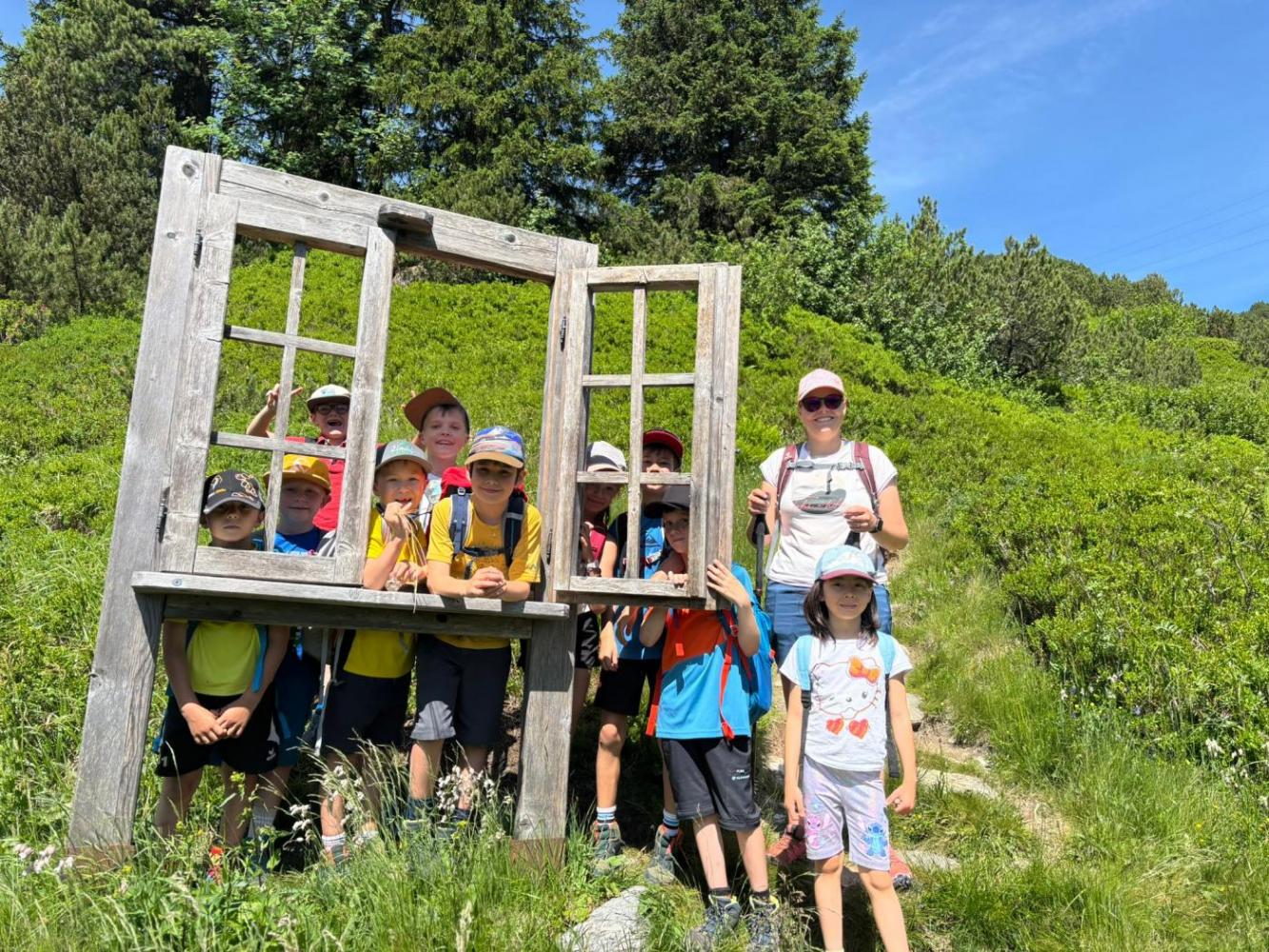 Gestärkt wanderten wir weiter zurück in Richtung St. Anton. Unterwegs entdeckten wir viele spannende Schilder mit interessanten Informationen zur Natur. Nach ein paar kurzen Verschnaufpausen erreichten wir den Wunderwanderweg. Barfuß über verschiedene Untergründe gehen, durch das Guggloch schauen, die Alpenglocke läuten, das Natur-Fenster entdecken und den Monsterbaum bestaunen – für alle war etwas dabei.